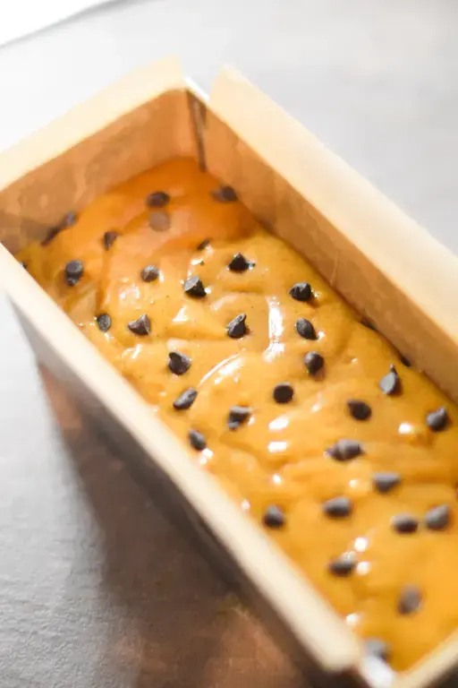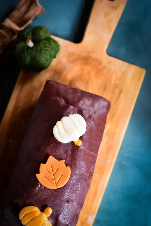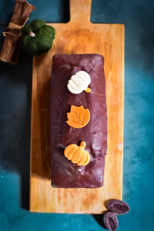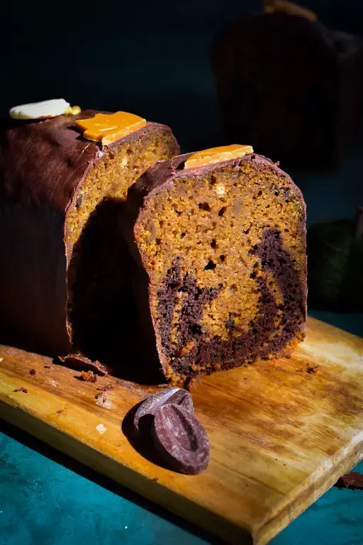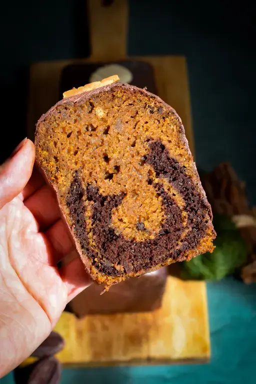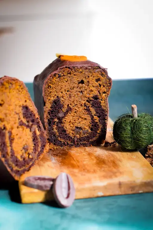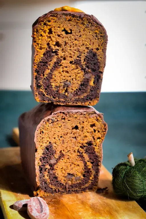 Pochez les pâtes en alternance dans un moule à cake beurré/fariné ou bien chemisé avec du papier sulfurisé (j’ai fait 3 couches de pâte potiron & 2 couches de pâte chocolat).