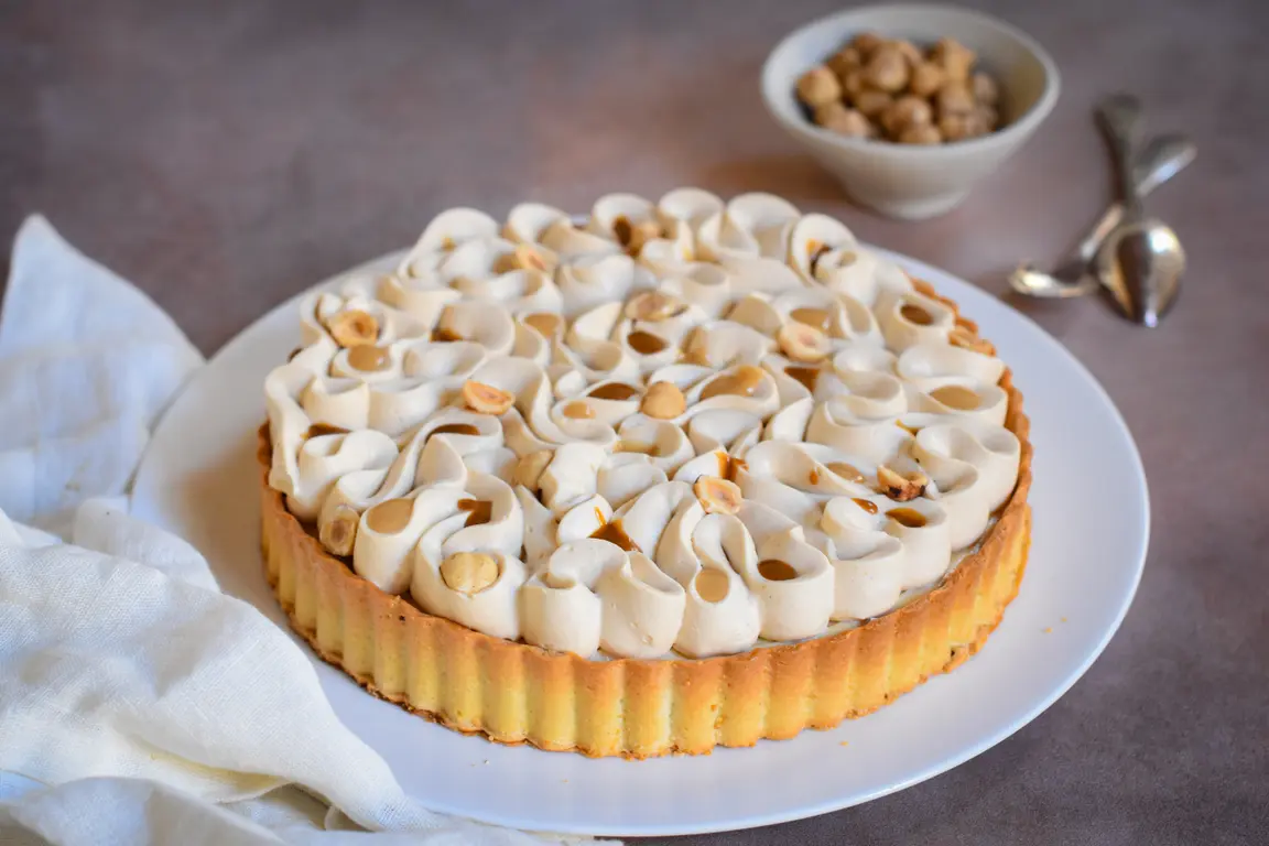 Pochez-la sur la tarte (j’ai utilisé une douille saint-honoré) puis décorez avec du praliné, de la purée de noisette et quelques demi-noisettes torréfiées avant de vous régaler !