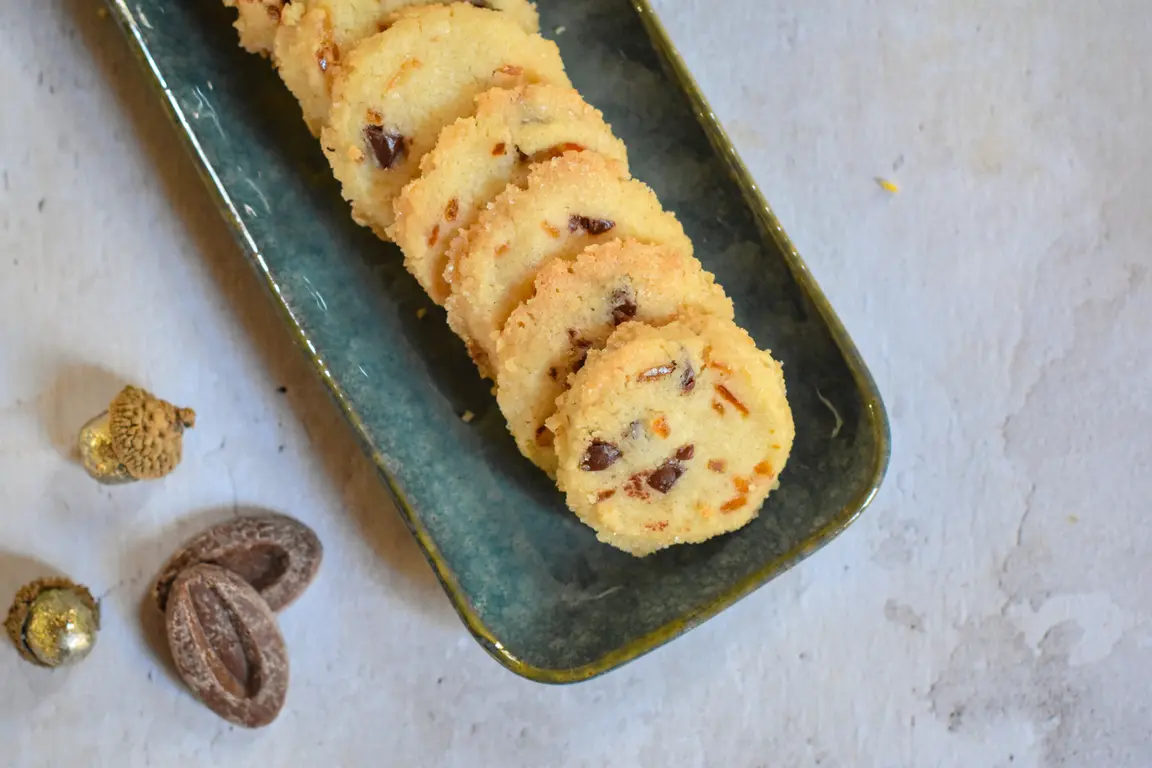 Bland det bløde smør med sukkeret og tilsæt derefter melet. Afslut med yuzu-skallerne og chokoladen. Form en lang stang og tril den i lidt sukker (det er valgfrit, det vil give en lidt sprødere tekstur til dine småkager).