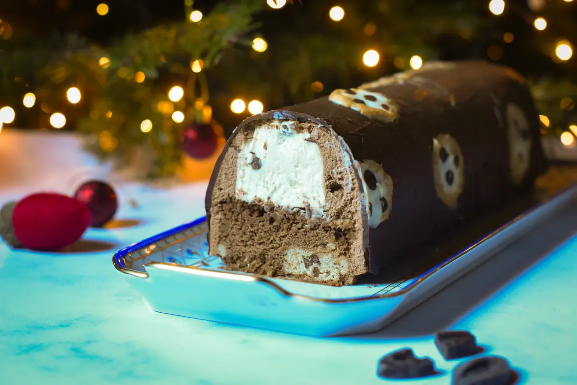 Stürzen Sie die gefrorene Log, legen Sie sie auf ein Gitter. Gießen Sie das Topping darüber und wenn Sie möchten, fügen Sie ein wenig geschmolzene weiße Schokolade hinzu, um „Kekse“ zu „zeichnen“. Stellen Sie die Log auf Ihre Servierplatte und lassen Sie sie mindestens 4 Stunden im Kühlschrank auftauen, bevor Sie sich erfreuen!