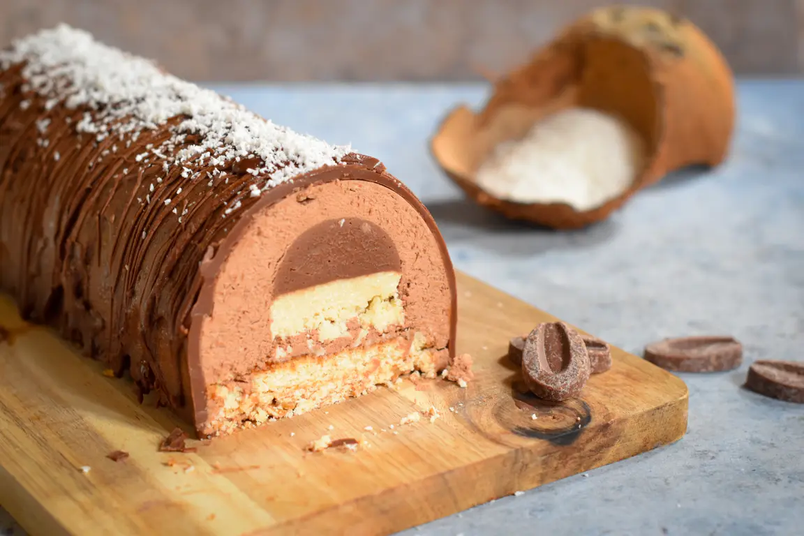 Полейте глазурью при температуре 35/40°C, затем добавьте тертый кокос. Поместите бревно на ваше сервировочное блюдо, в холодильник минимум на 3 часа перед тем, как насладиться 😊