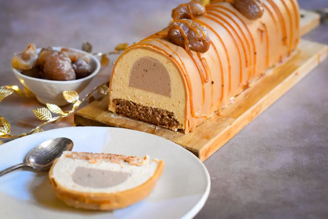 Häll glasyren över loggen. Låt kristalliseras och dekorera sedan med lite karamell och några glasyrda kastanjer. Låt loggen tina i kylskåpet i minst 4 timmar innan ni njuter av den!