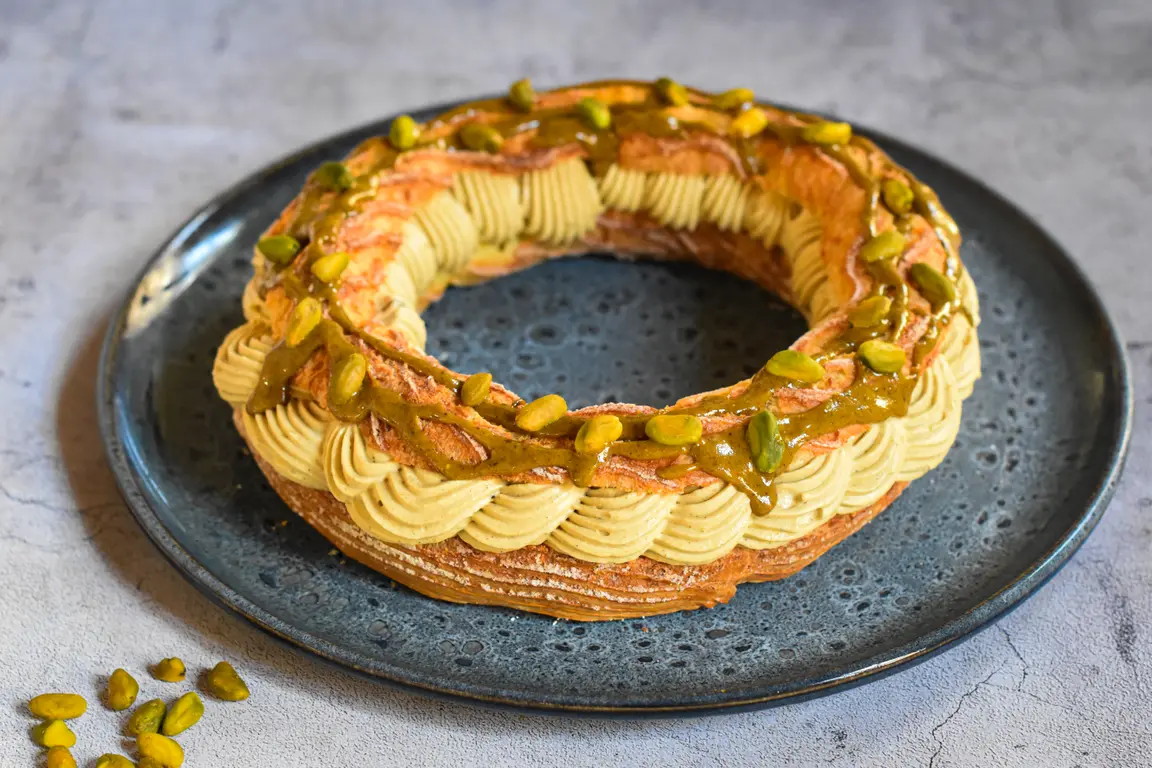 Funga na juu ya taji ya mchanganyiko wa choux, kisha ongeza kidogo cha praliné na pistachio chache kabla ya kufurahia!